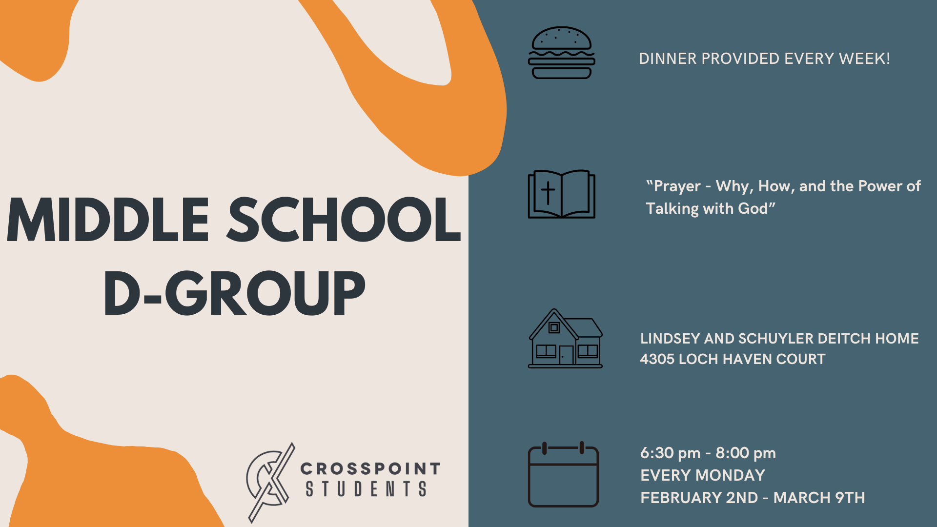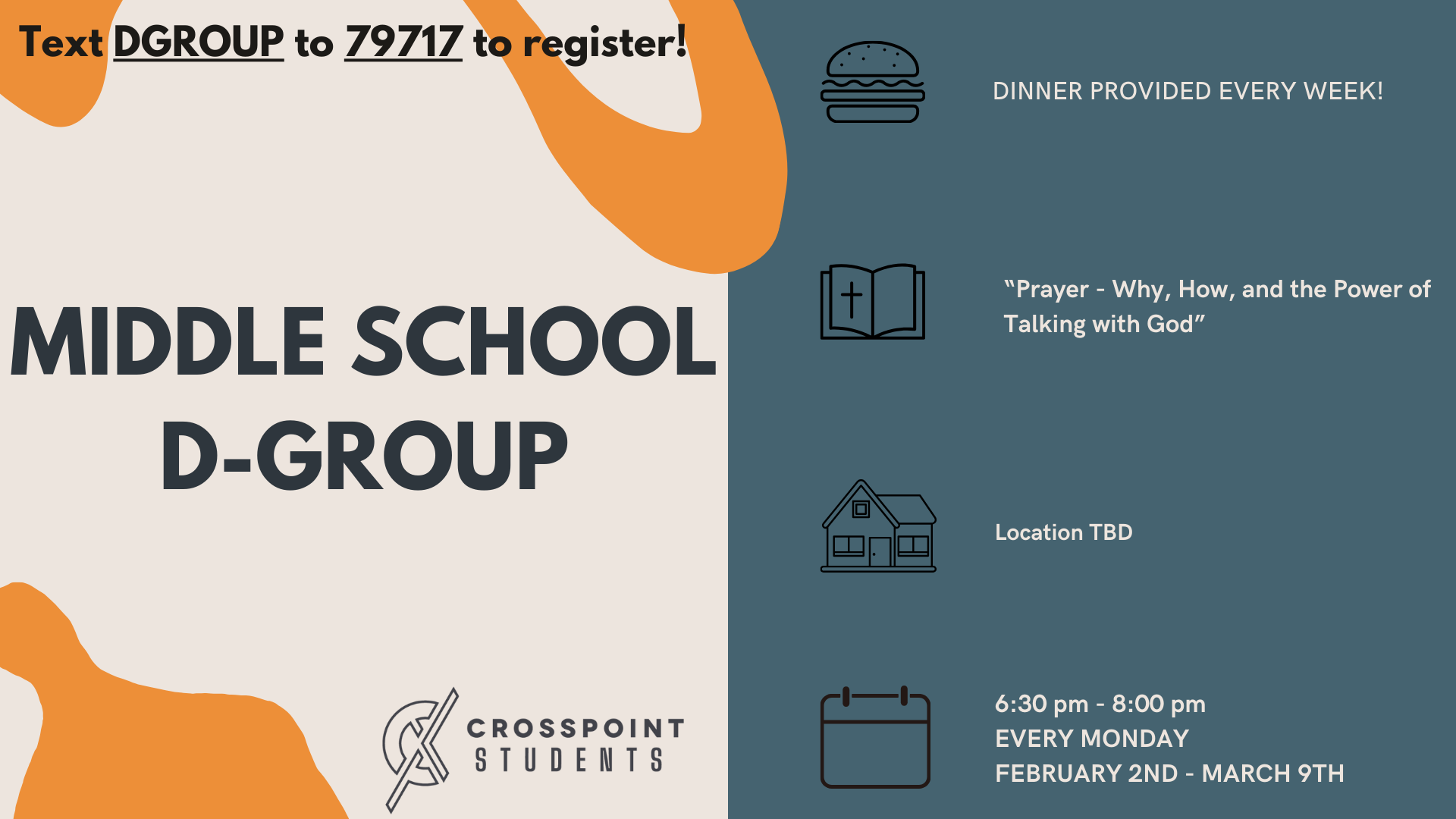 At Crosspoint, large group teaching on Wednesday night and Sunday morning serves to unify and engage students with a shared message. It fosters community, promotes spiritual growth, and allows for dynamic presentations. This format helps convey key teachings, encourages discussions, and can have a lasting impact on the participants' faith journeys and personal development.